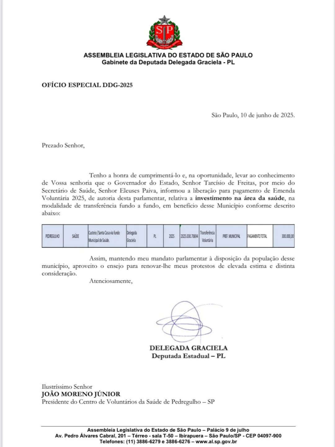 A Santa Casa de Misericórdia de Pedregulho registrou o recebimento de uma importante verba de custeio no valor de R$ 300 mil, destinada pela deputada estadual Delegada Graciela (PL). O recurso foi repassado por meio da Prefeitura Municipal de Pedregulho, que mantém parceria constante com a instituição na promoção da saúde pública.